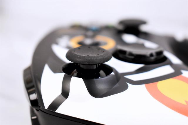 兩個搖桿的鍵帽采用的是硅膠材質,鍵帽做了下凹設計,同時搖桿帽上有很多圈的紋理,在出汗情況下也能讓大拇指盡力控制住搖桿的方向。在保證了手感的同時也能提高整體的游戲體驗感。