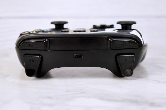 手柄前端依舊是熟悉的LB肩鍵、RB肩鍵、RT扳機鍵、RB扳機鍵。其中ZL和ZR鍵的鍵程要稍微長一點,很適合在射擊類游戲中體驗扣動扳機的感覺,對于賽車類游戲對應的油門和剎車也能夠更加精細操作。中間位置是MicroUSB充電接口。沒有用到Type-C接口稍顯遺憾。